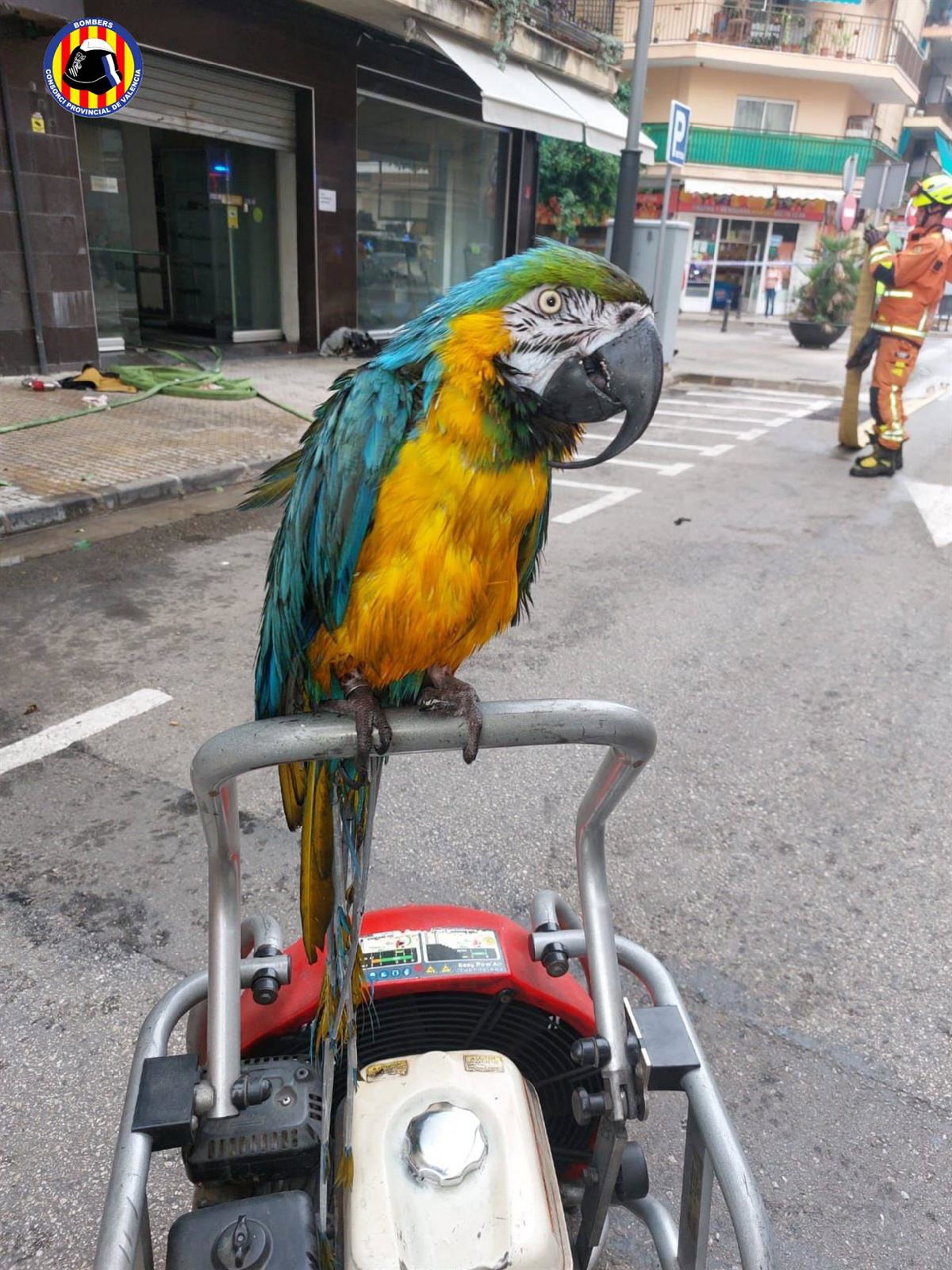 Efectivos de bomberos han rescatado a un loro después de incendiarse el local de sus dueños, un establecimiento de venta y reparación de patinetes eléctricos en Gandia (Valencia).