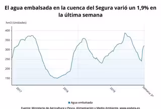 En el caso del Júcar, los embalses almacenan 1.014 hectómetros cúbicos de agua de los 3.337 que tienen de capacidad, frente a los 935 del año pasado y los 1.218 de la media de los últimos diez años. En el Segura, los pantanos cuentan con 321 hm3 de los 1.140 que hay, menos que los 249 de 2018 y los 466 de la media de diez años.