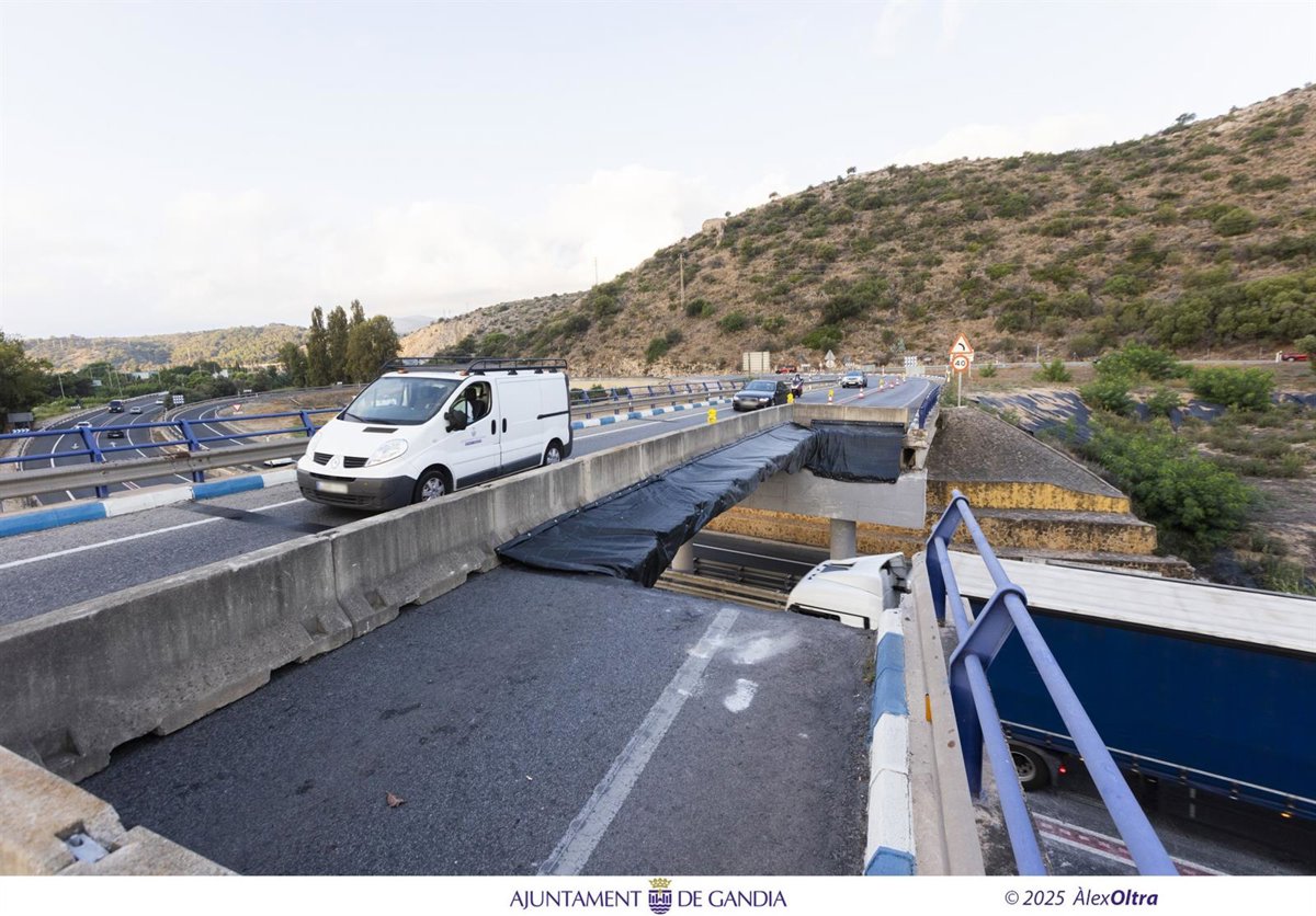 El siniestro se produjo sobre las 1.40 horas del jueves, cuando un camión chocó accidentalmente mientras circulaba por debajo del puente de la carretera que va hacia la playa de Gandia. Quedó afectada la estructura del puente, así como un turismo y una moto. Obligó al cierre total e inmediato al tráfico de la N-337 entre los kilómetros 0 y 1,5, y de la N-332 entre los kilómetros 225 y 226.