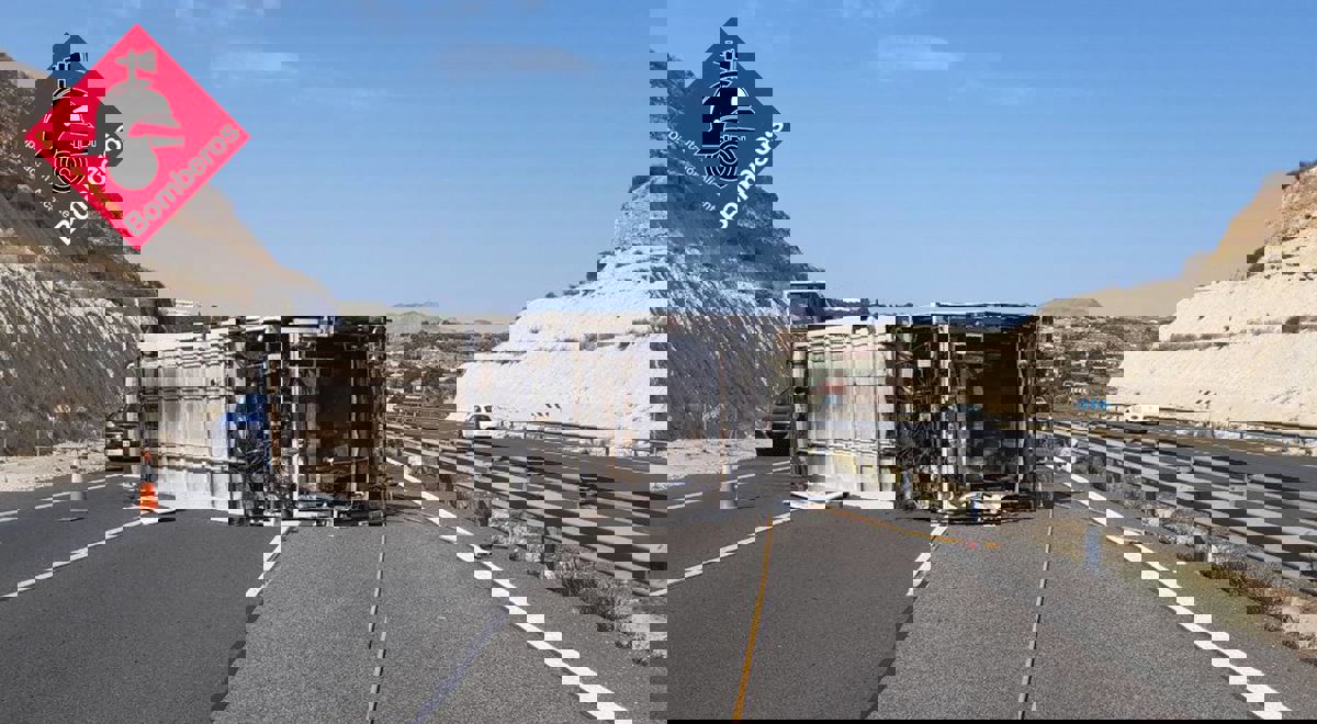 El camión ha volcado hacia el lado derecho de la vía ocupando los tres carriles de la misma. El depósito del vehículo de grandes dimensiones ha sufrido una fuga de combustible, un hecho que ha obligado a solicitar el corte de la A-7 en este punto y a desviar el tráfico por el arcén derecho hasta la salida más próxima.