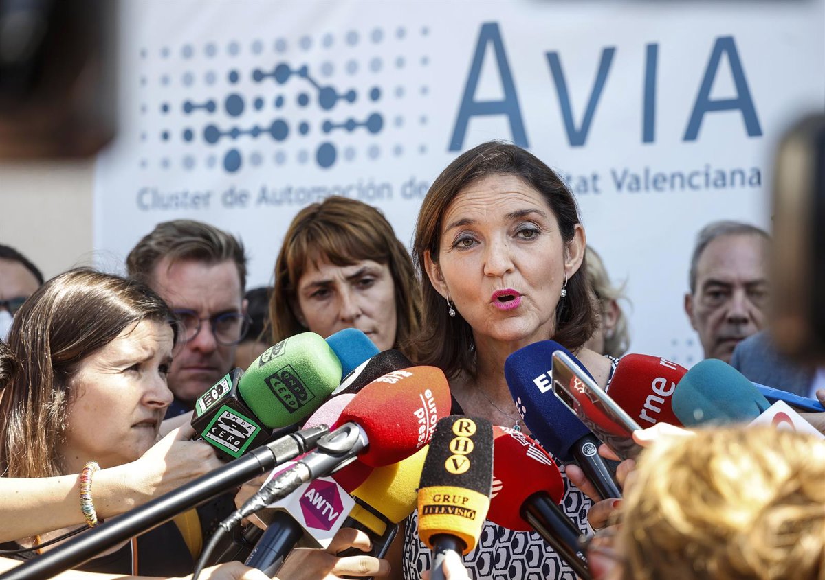 La ministra de Industria, Comercio y Turismo, Reyes Maroto, atiene a los medios tras una reunión con el Clúster de Automoción de Valencia, a 10 de junio de 2022, en Almussafes, Valencia, Comunidad Valenciana (España). - Rober Solsona - Europa Press