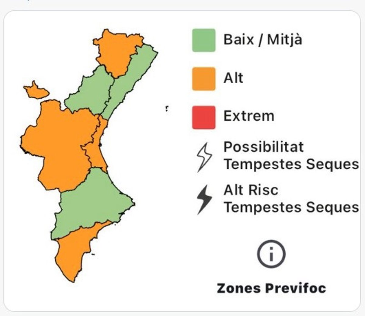 Emergencias 112CV ha señalado que ese nivel de preemergencia por riesgo de incendios forestales es bajo-medio en el resto de la Comunitat Valenciana.