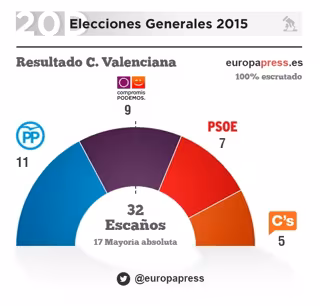 El fin del bipartidismo hegemónico plasmado en las elecciones generales del 20 de diciembre ha tenido su reflejo en la Comunitat Valenciana, cuyo mapa queda configurado por cuatro partidos y coloca a la confluencia Compromís-Podemos como segunda fuerza más votada, por delante del PSOE.
