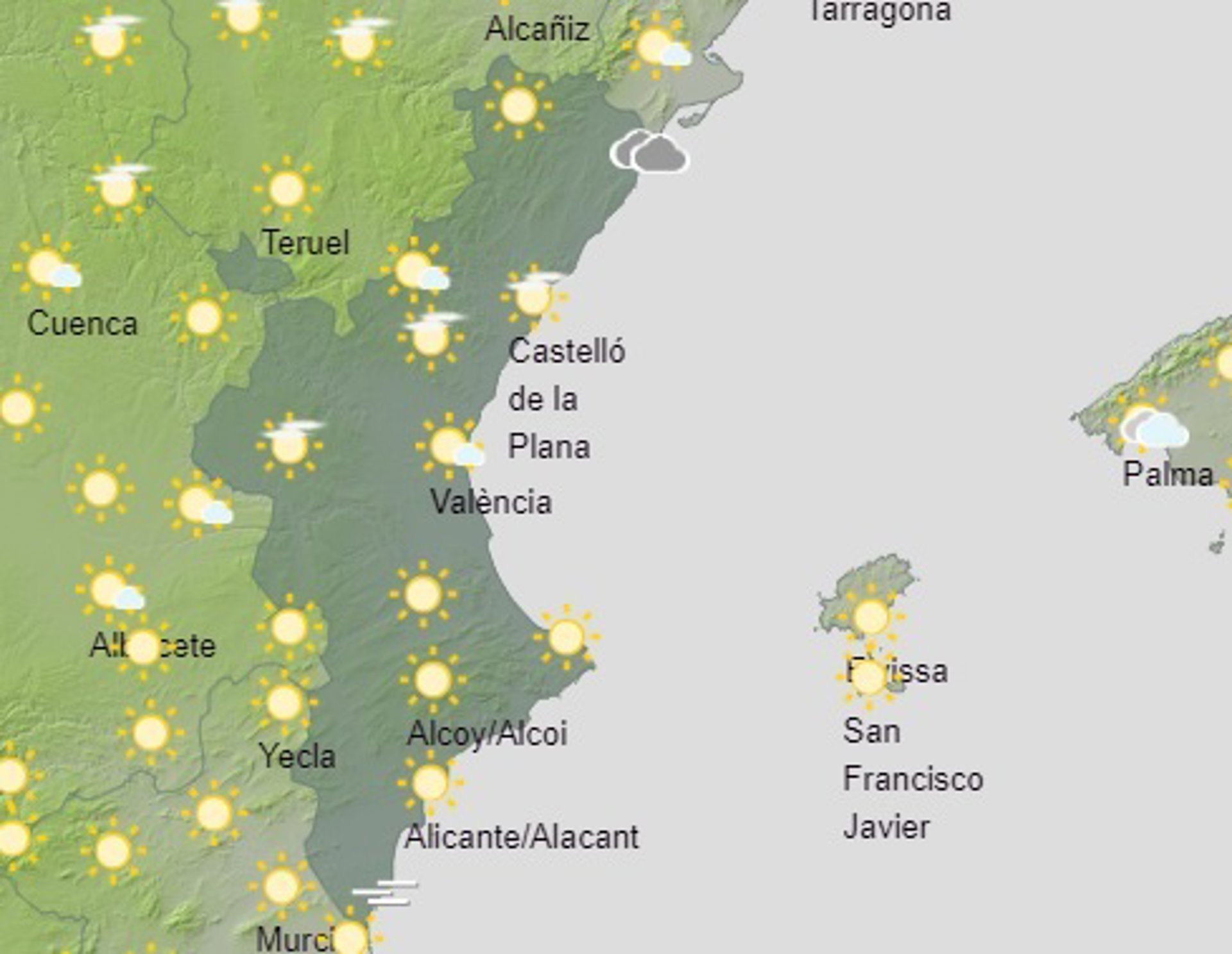 Las temperaturas también serán significativamente altas en puntos de la provincia de Alicante, según la predicción de Aemet. En general, predominará el cielo poco nuboso o despejado, con nubosidad baja matinal en el litoral norte y nubosidad de evolución por la tarde en el interior norte de Castellón, donde no se descarta que pueda dejar algún chubasco aislado.