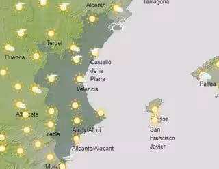 Por su parte, soplará viento de componente oeste flojo en el interior y brisas en el litoral. En la provincia de Castellón, las temperaturas máximas alcanzarán los 31 grados en Morella y los 30 en Castelló de la Plana y La Vall d'Uixó. Las mínimas se situarán entre los 16 y los 21.