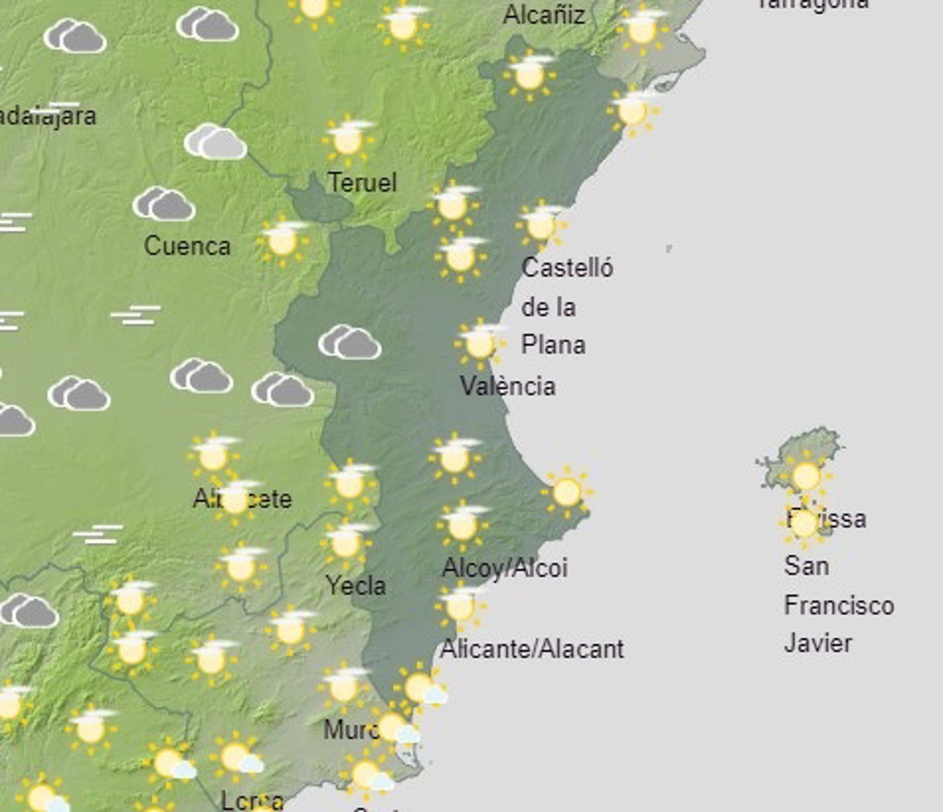 Finalmente, en Alicante, se esperan máximas de 23 en Elx, 22 en Alicante, 21 en Dénia y Orihuela, y 19 en Alcoi. Las mínimas serán de 6 en Alcoi, 10 en Orihuela y Elx, y 11 en Alicante y Dénia.