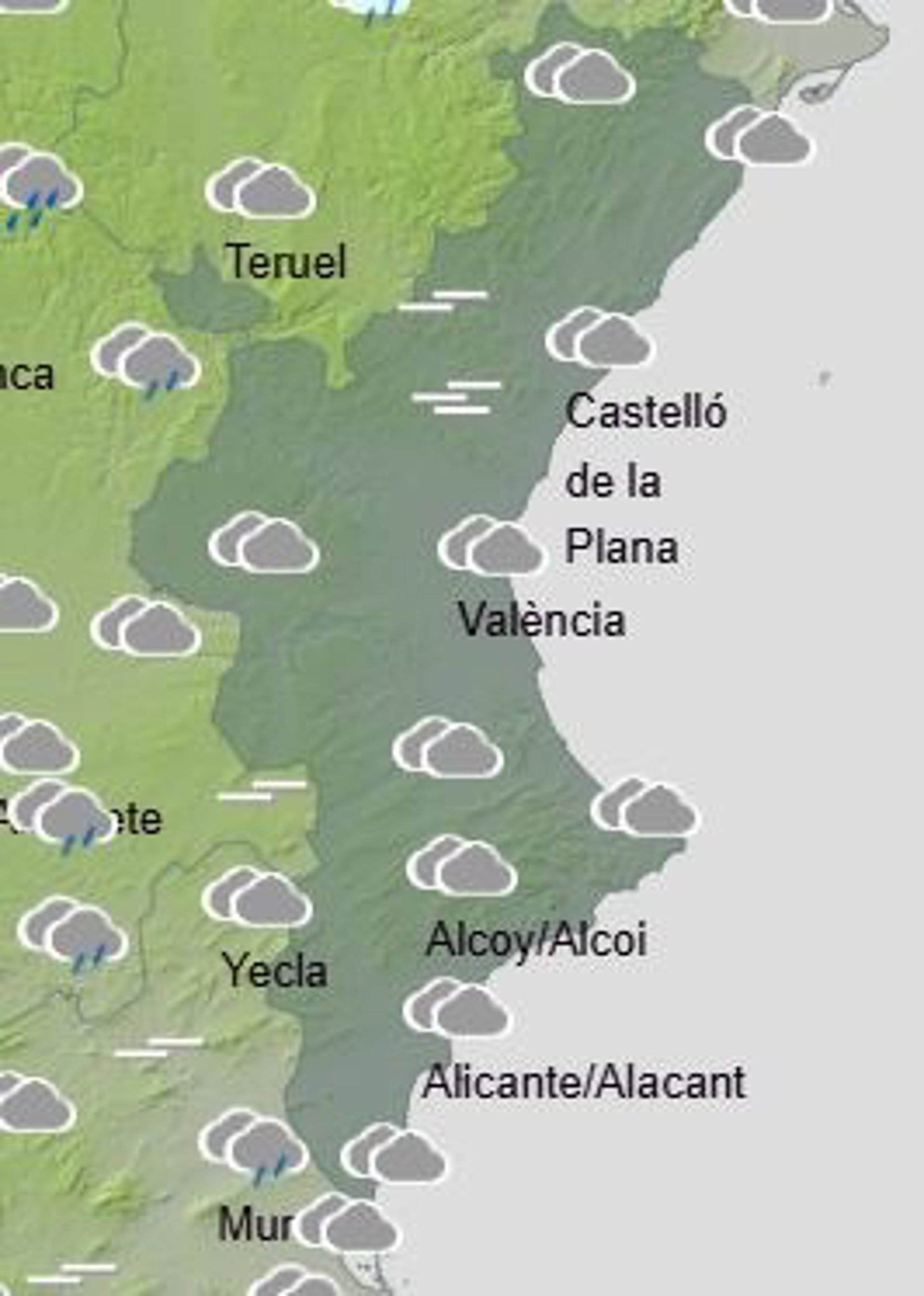 Finalmente, en Alicante, se esperan máximas de 19º en Alicante, Dénia, Elche y Orihuela, y 17º en Alcoi. Las mínimas serán de 10º en Alcoi, 12º en Dénia y Elche, y 13º en Alicante y Orihuela.