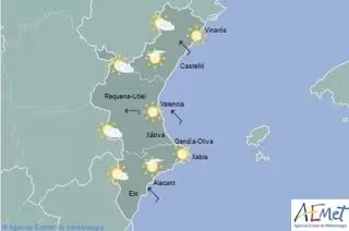 La temperatura más alta de la jornada se prevé en Ontinyent, con 37 grados, mientras que en Alcoi, Castelló, Orihuela, Requena y Vinaròs se prevén 35 grados. En València la máxima se quedará en 35, mientras que Alicante registrará la máxima más baja, con 32 grados.