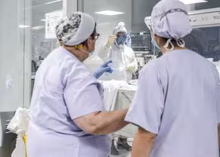 Trabajadores sanitarios totalmente protegidos atienden a un paciente con coronavirus ingresado en la UCI del Hospital Arnau de Vilanova al inicio de la pandemia - Rober Solsona - Europa Press - Archivo