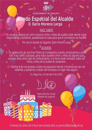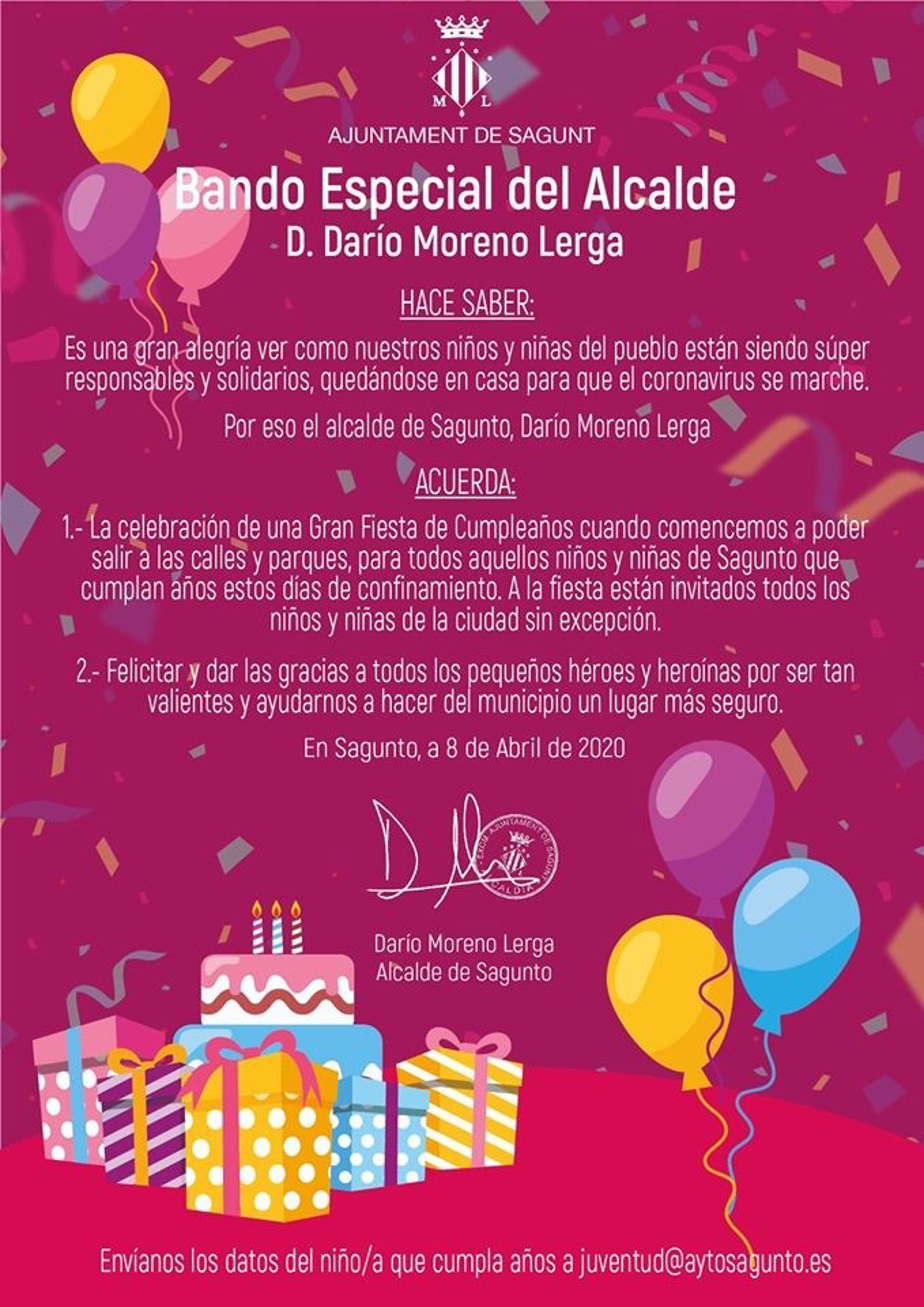 El alcalde de la localidad valenciana de Sagunto, Darío Moreno, ha dictado un bando especial para celebrar una futura macrofiesta de cumpleaños para todos los niños y niñas del municipio que durante este confinamiento hayan cumplido años a la también están invitada toda la infancia de la ciudad.