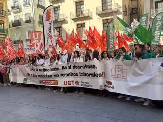 SATSE, CCOO, UGT e Intersindical se han concentrado este martes frente al Palau de la Generalitat al grito de 'Mazón cesa al campeón' y 'Marciano dimisión' para exigir el fin de la "dictadura" en la gestión sanitaria y la retirada del decreto ley de las macroáreas porque, advierten, no solo "no resolverá" la situación de las plazas de difícil cobertura, sino que "provocará la fuga de nuestros profesionales a otras comunidades" y "afectará a la calidad asistencial de la población".