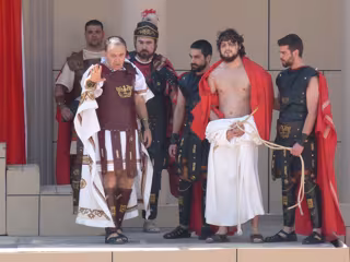 Tras la representación del juicio a Jesús ante Pilatos se ha iniciado el desfile por la calle de la Amargura en el que se han recreado varias estampas como las caídas del Señor, el encuentro con su madre, la ayuda de Cirineo y el gesto piadoso de la Verónica hasta el Monte Calvario, donde se produjo la crucifixión.