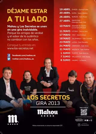 Tras el arranque en Oviedo, Los Secretos pasarán por Gijón, Burgos, Pamplona, Aranda de Duero, Pamplona, Vitoria, Vigo, Salamanca, Lleida, Zaragoza, Valencia, Murcia, Valladolid y Madrid.
