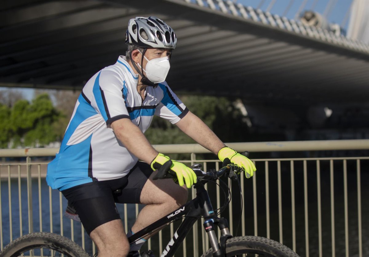 Un ciclista protegido con mascarilla, en el día en que el Gobierno permite salir a hacer deporte de forma individual en Sevilla (Andalucía, España), a 02 de mayo de 2020. - María José López - Europa Press