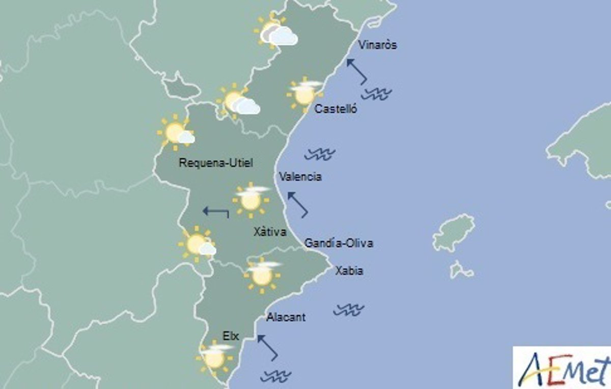 Las tres capitales de provincia anotarán máximas suaves de 26 grados y mínimas de 17 grados durante esta jornada. El día será algo más caluroso en puntos de Alicante como Orihuela, Elche y Dénia, donde el termómetro marcará 28, 27 y 27 grados, respectivamente, y especialmente en Ontinyent (Valencia) con hasta 29 grados.