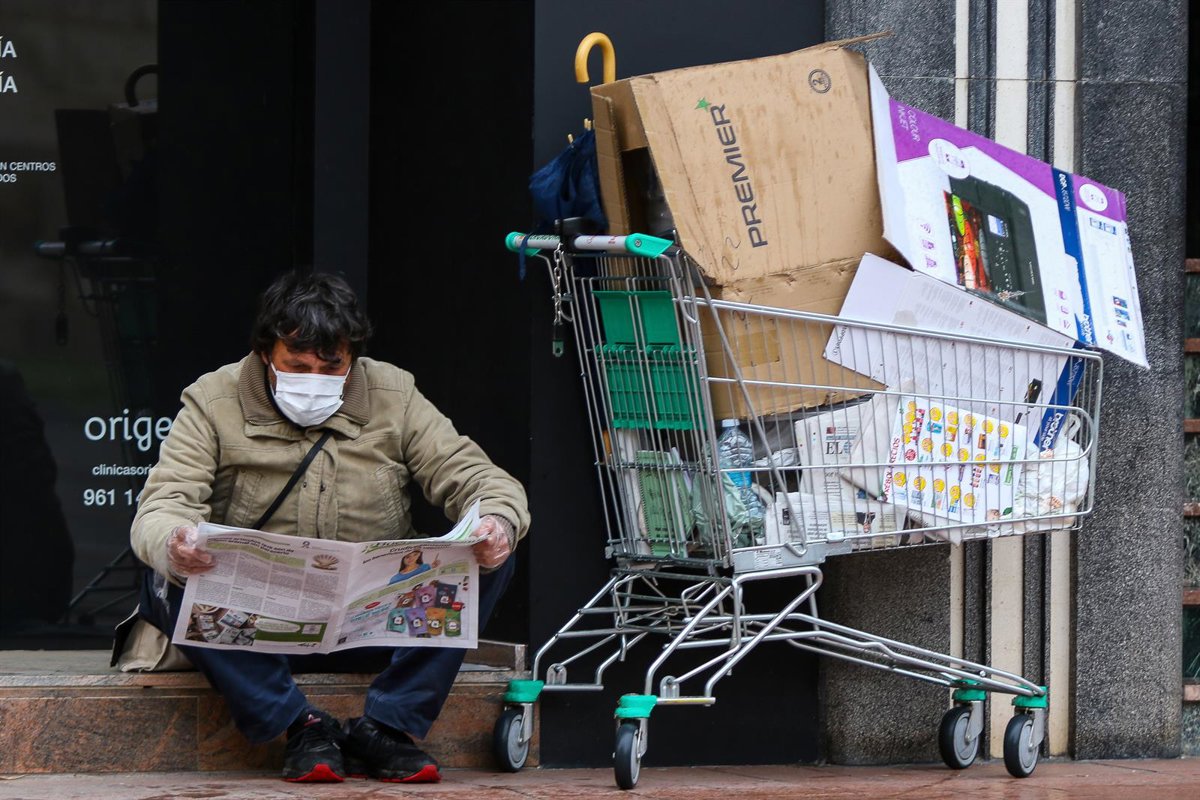 Archivo - Una persona sin hogar lee un periódico junto a un carrito lleno de cartones en imagen de archivo - Iván Terrón - Europa Press - Archivo