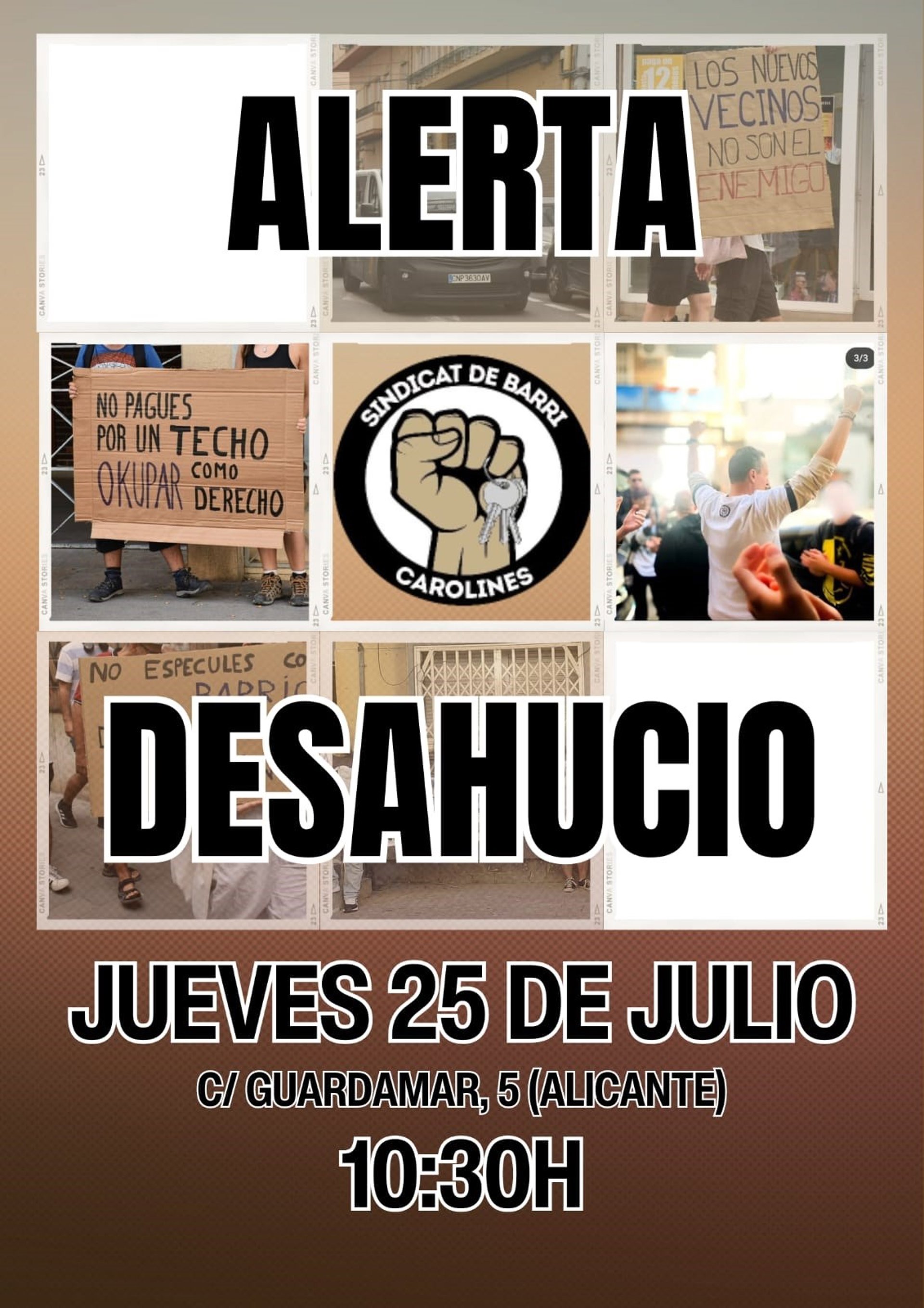 La organización vecinal ha hecho un llamamiento a la ciudadanía para acudir este próximo jueves de 25 de julio a las 10.30 horas en la calle Guardamar número 5 de Alicante "para impedir que otra familia más sea expulsada de su casa", según ha indicado en un comunicado.