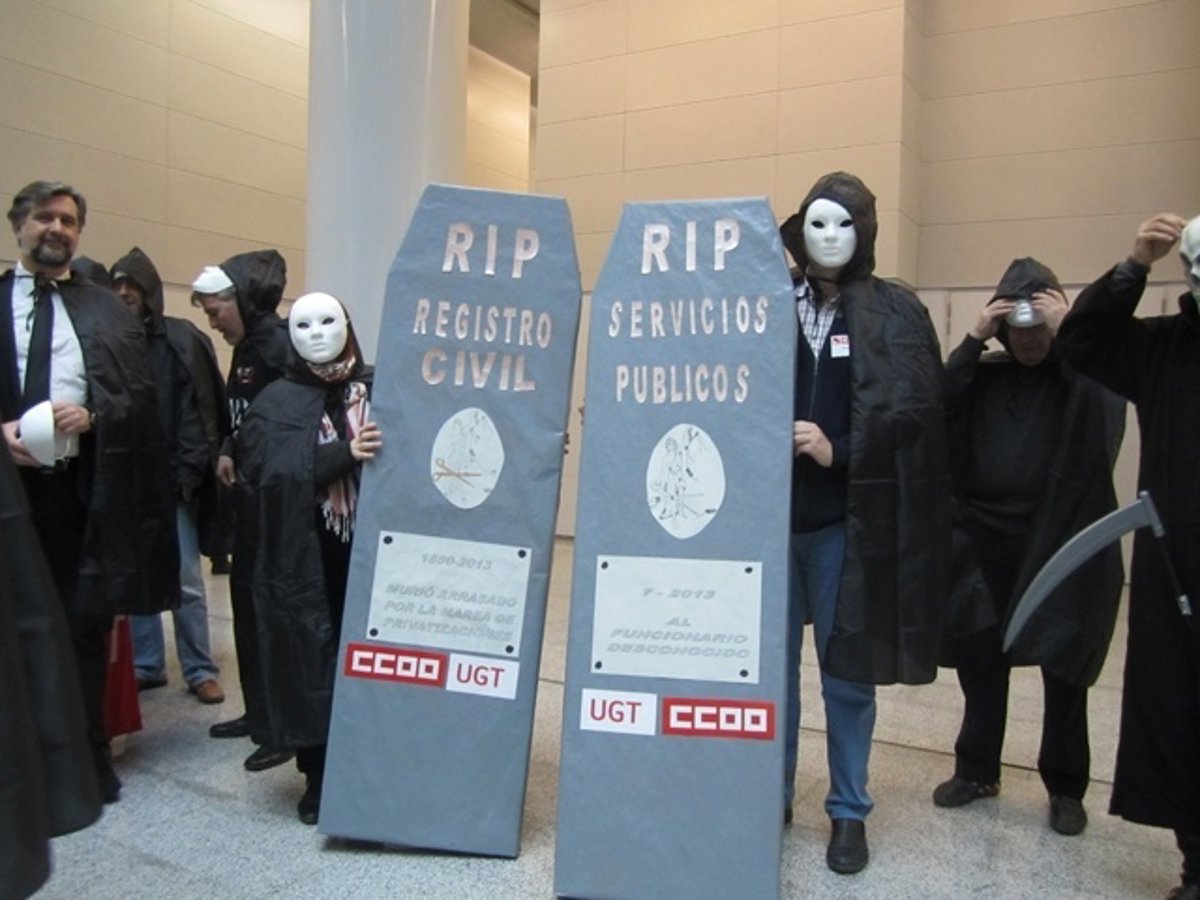 En el acto, CCOO y UGT han realizado una representación con la simulación de la muerte de la Justicia y han marchado en cortejo fúnebre, acarreando las lápidas de los difuntos Registros Civiles y los Servicios Públicos.