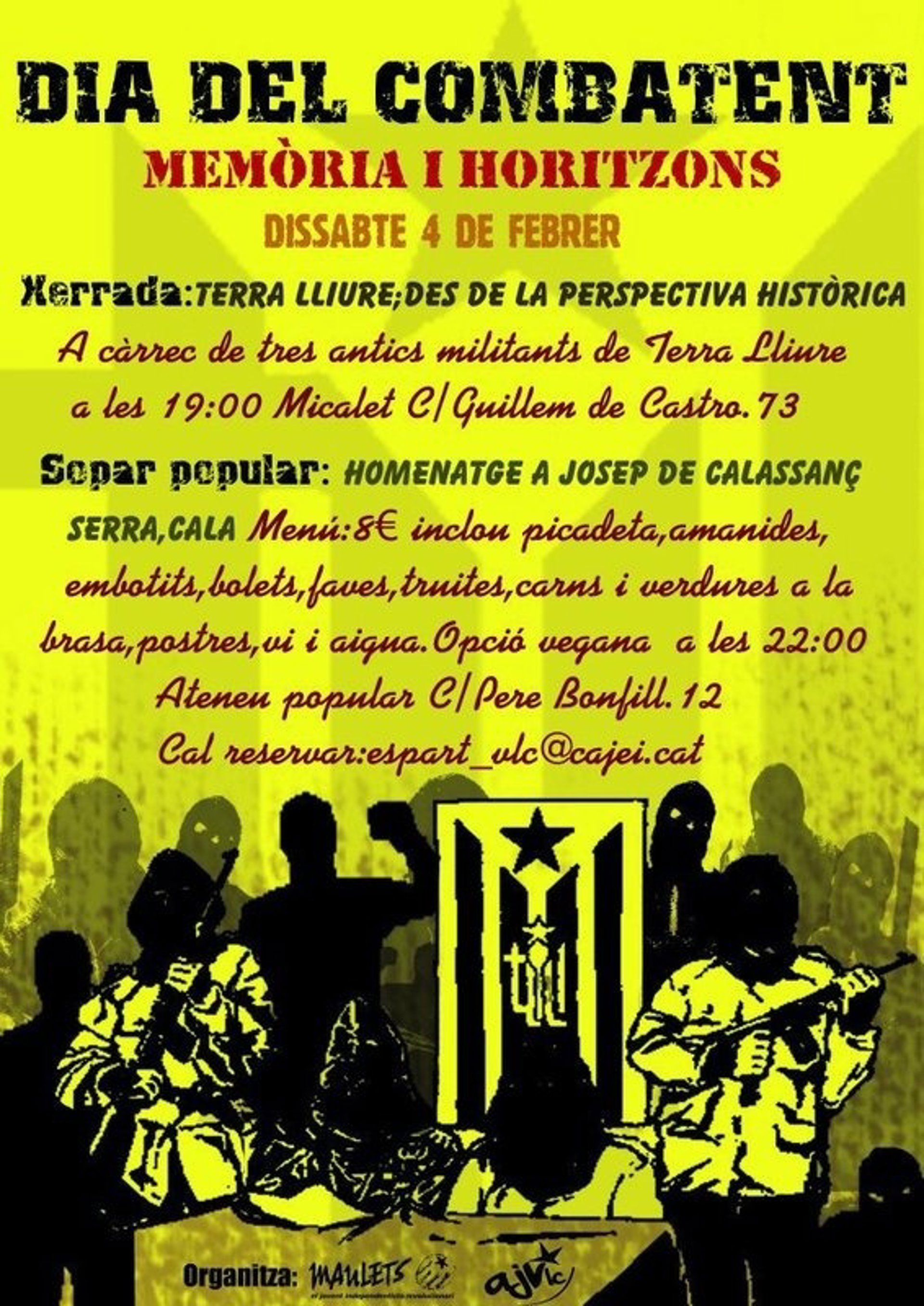 El acto, convocado bajo el título del 'Día del Combatiente', contiene además un homenaje al fundador de Terra Lliure, Josep de Calassanc Serra, uno de los fundadores de la banda terrorista. Así mismo, en el cartel de convocatoria del evento aparece el dibujo de varias personas encapuchadas y portando armas junto a las siglas de dicha organización, según informa la AVT en su página web.