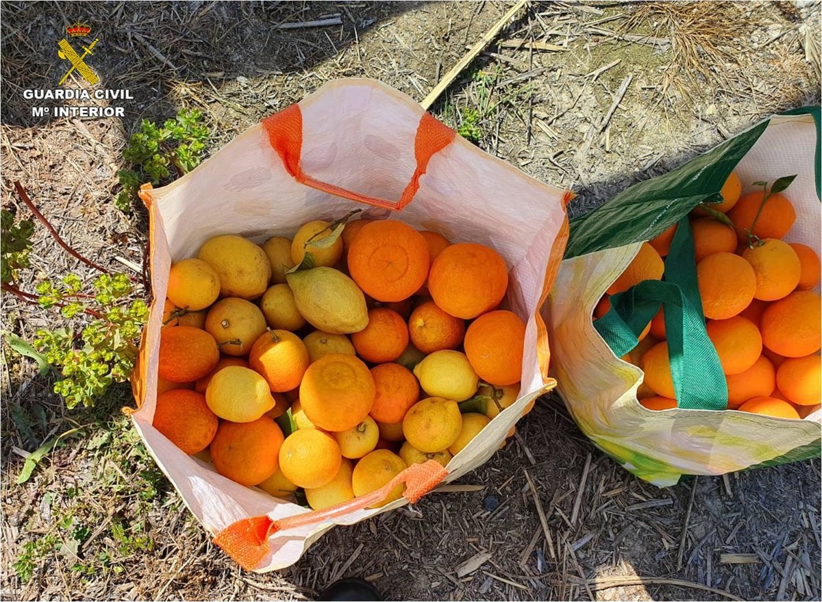 Agentes de la Guardia Civil han dneunciado a dos hombres a los que sorprendieron prefuntamente infringiendo las medidas del estado de alarma para robar 30 kilos de naranjas y limones en un campo de La Llosa de Camacho, en Alicante.