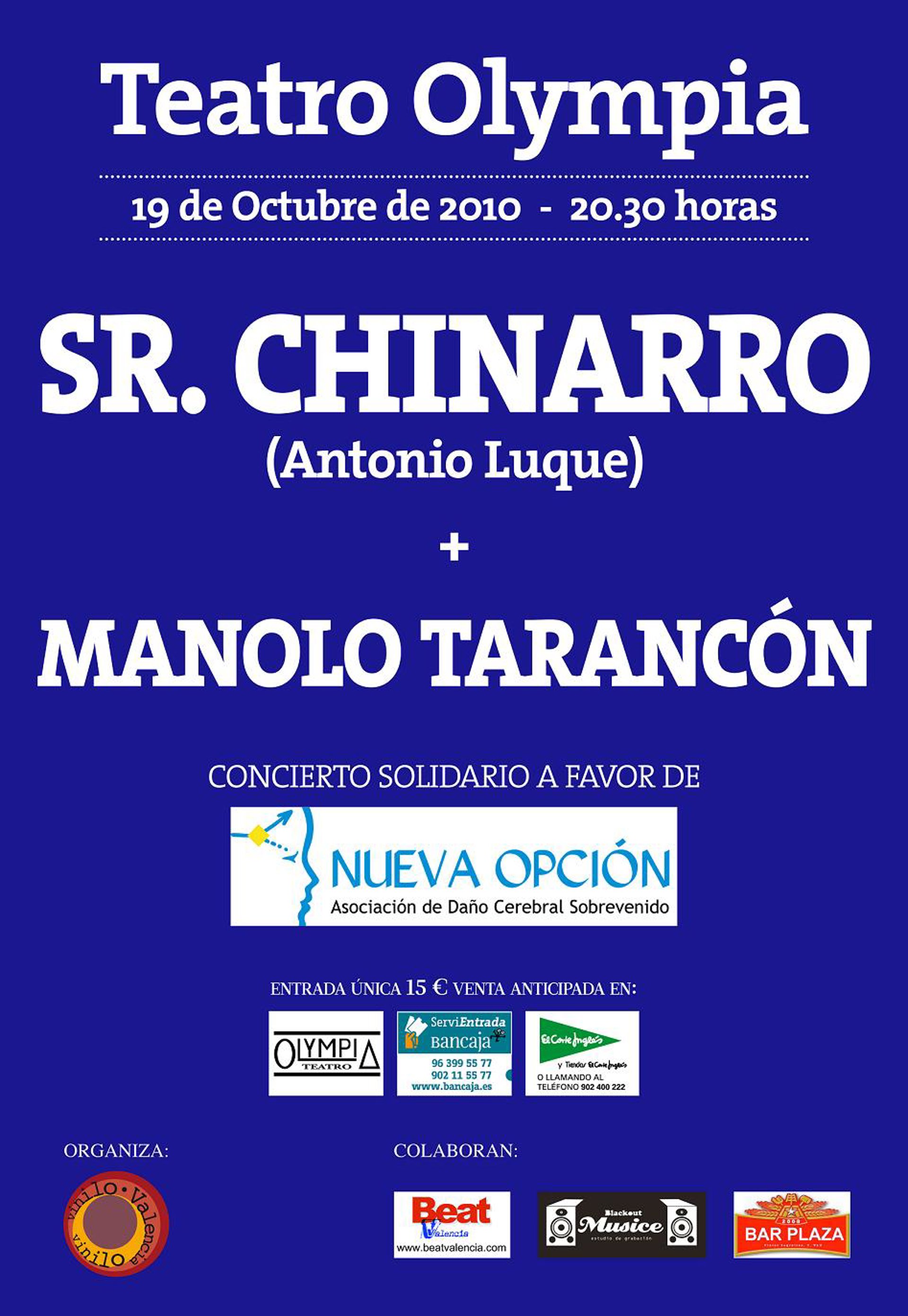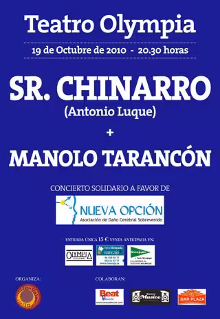 Antonio Luque (Sr.Chinarro) y Manolo Tarancón actuarán el próximo martes 19 de octubre en el Teatro Olympia de Valencia, en un concierto en beneficio de la Asociación Nueva Opción, una institución sin ánimo de lucro que lleva desde 1995 trabajando a favor de los derechos de las personas afectadas por el daño cerebral sobrevenido y de sus familiares, según han informado fuentes de la organización.