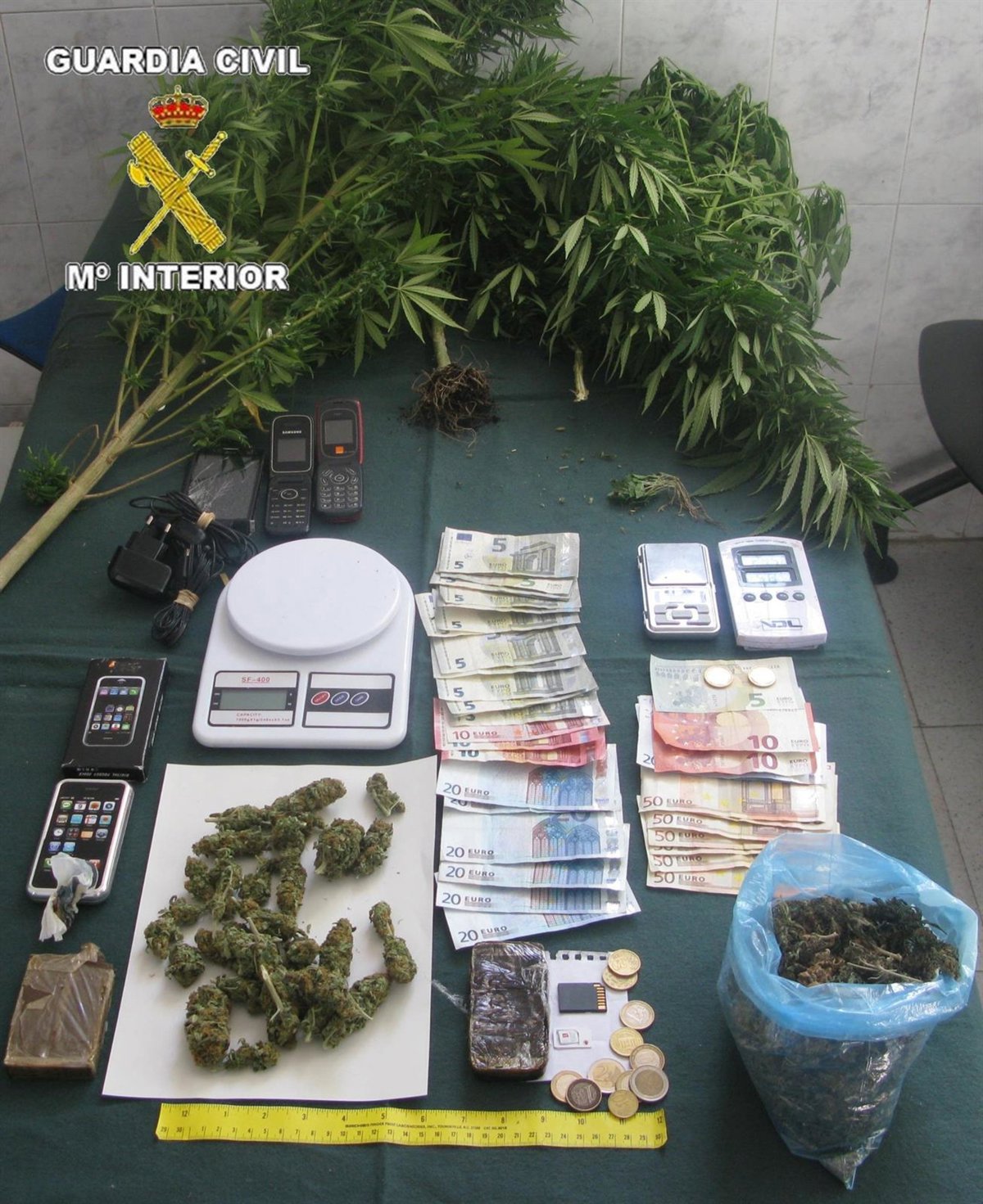 En los mismos, se intervinieron 156 gramos de marihuana (dispuesta para su venta); 181 gramos de hachís (en tabletas); dos gramos de heroína; una plantación del tipo de cultivo hidropónico (cultivo de planta en soluciones acuosas, por lo general con algún soporte de arena o grava) con 23 plantas de marihuana; un secadero de marihuana; tres balanzas de precisión; herramientas sospechosas de proceder del robo; y 722 euros en moneda fraccionada proveniente, probablemente, de la venta al menudeo de estupefacientes.