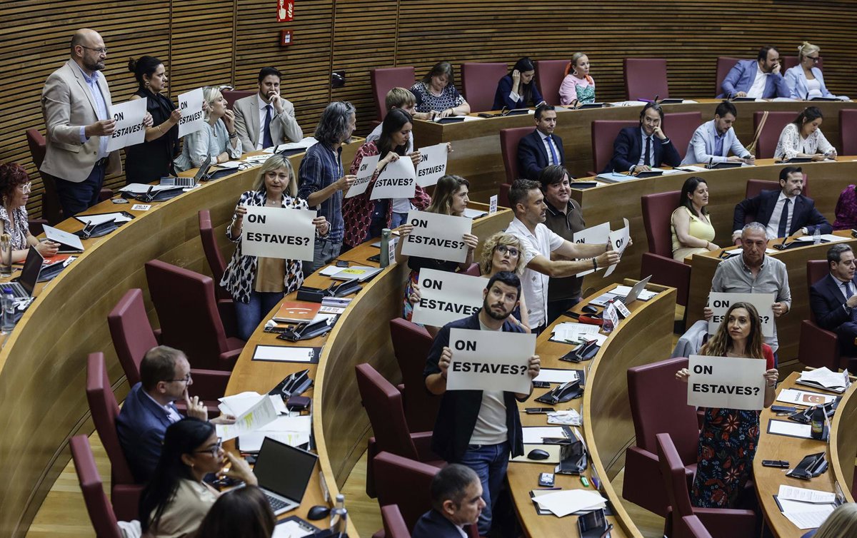 El pleno de Les Corts Valencianes ha sido suspendido durante unos diez minutos a raíz de una protesta de los diputados de Compromís, que han exhibido carteles de 'On estaves? ('¿Dónde estabas?') dirigidos hacia 'president' de la Generalitat, Carlos Mazón, en alusión a la tarde del 29 de octubre, el día de la dana que arrasó gran parte de la provincia de Valencia.