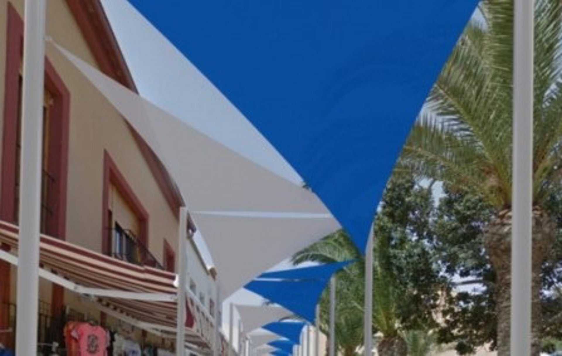 El proyecto contempla que el montaje de los toldos de tela de sombra será "de alta calidad", diseñados para estructuras de tensión y toldos de arquitectura comercial en formato triangular y rectangular, con soportes en una base prefabricada. Se trata de unos toldos tipo vela que protegen del sol y de los rayos UV, confeccionados con tejido transpirable.