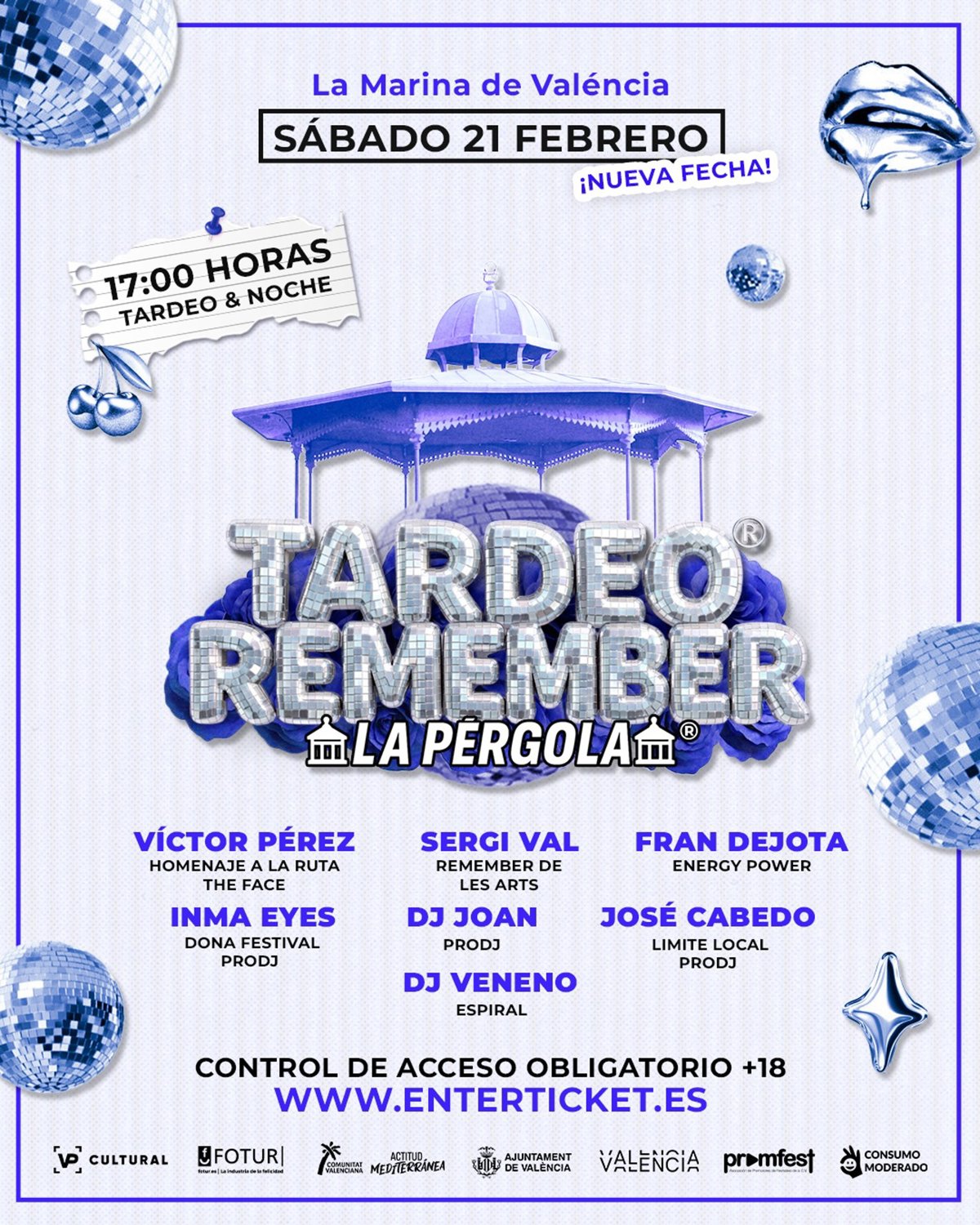 La organización del Tardeo Remember La Pérgola ha comunicado el aplazamiento del evento previsto inicialmente para el 14 de febrero debido a motivos meteorológicos adversos. La cita se celebrará finalmente el sábado 21 de febrero en La Pérgola de la Marina Norte de València, manteniendo su horario habitual, desde las 17.00 horas y hasta el cierre, tarde y noche sin pausa.