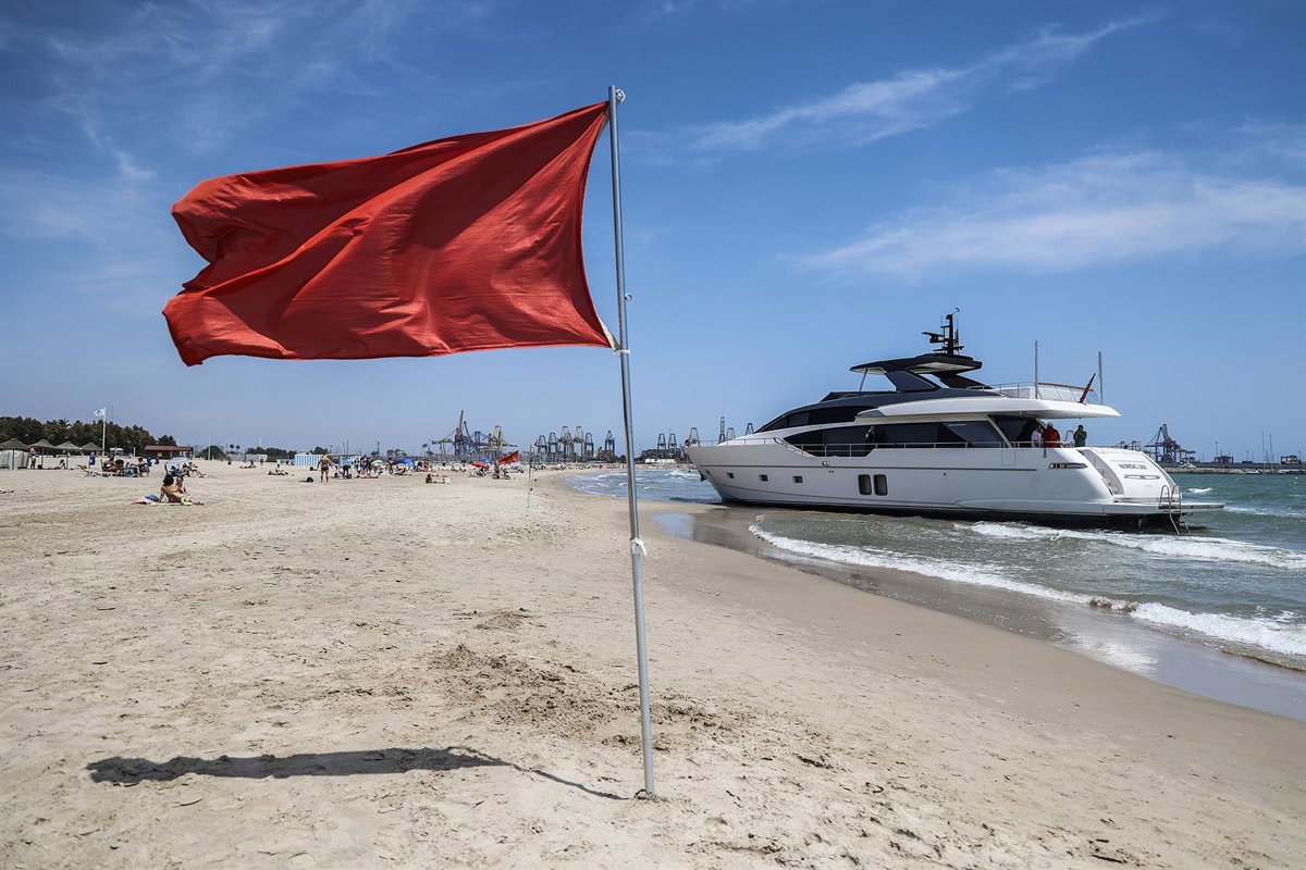 Una bandera roja delante del yate varado en la Playa de Pinedo - Rober Solsona - Europa Press