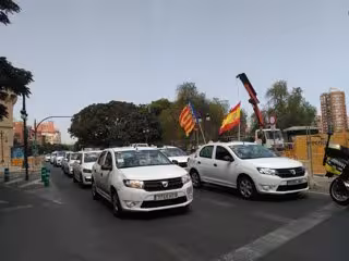 La acción reivindicativa, con el lema 'No a las 12+4, por una regulación democrática aprobada en urnas', ha comenzado en el Complejo Administrativo 9 de Octubre, en la Conselleria de Vivienda, Obras Públicas y Vertebración del Territorio, donde el presidente y el Vicepresidente de la Asociación Gremial Provincial de Autotaxis de Valencia, Ismael Arráez y José Miguel Sanz, respectivamente, han subido a hablar con el director general de Obras Públicas Transporte y Movilidad, Carlos Domingo, acompañados por la presidenta de la Plataforma de Afectados por la Nueva Ley del Taxi, Isabel Segura, y por el Presidente de Eurotaxi Adaptado Valencia, Ricarlo Pardo.