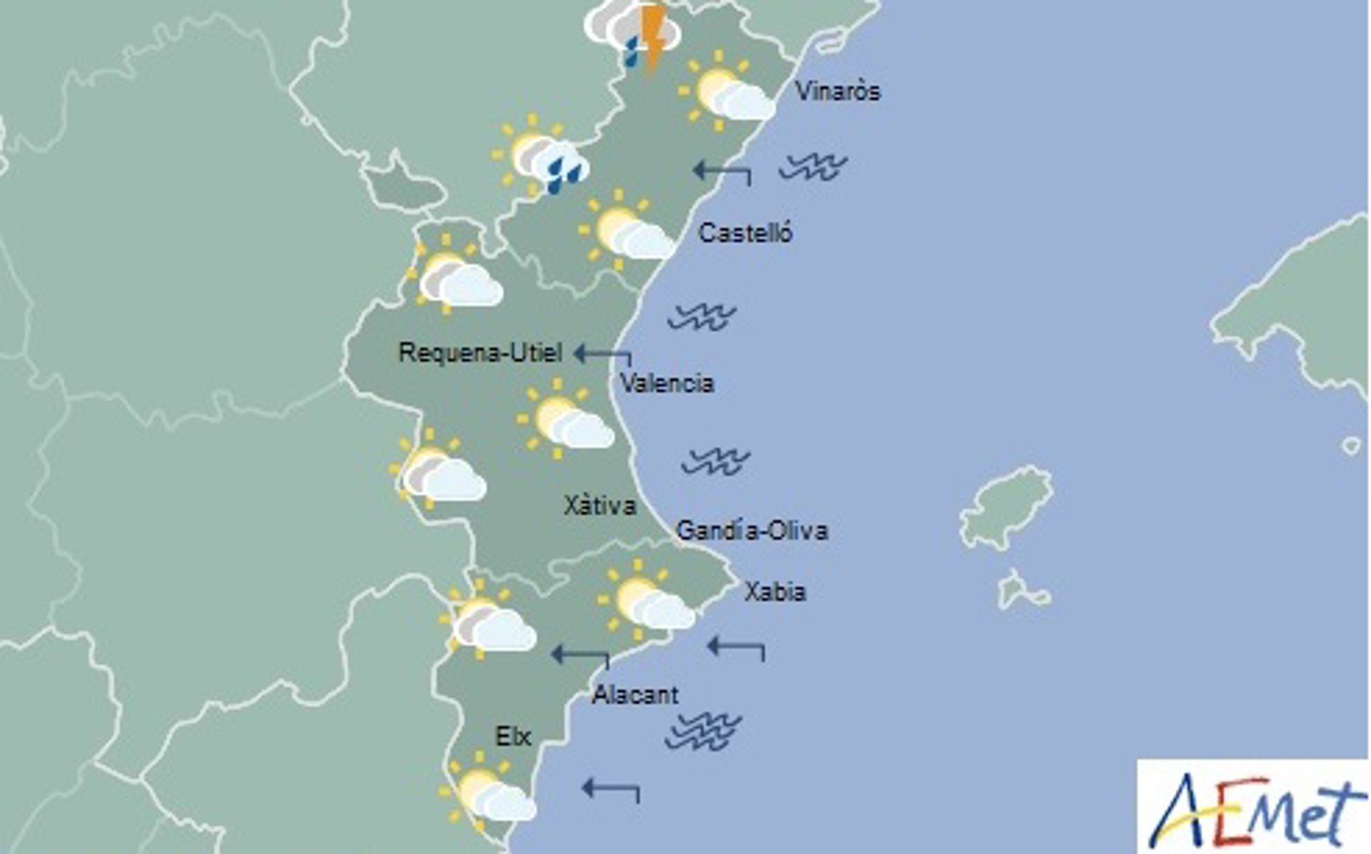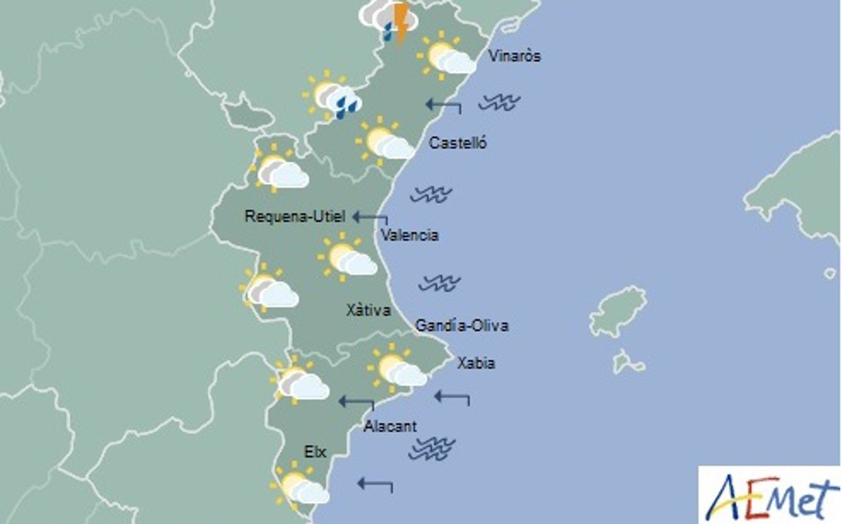 Según la predicción de la Agencia Estatal de Meteorología (Aemet), tanto en la provincia de Valencia como en la de Alicante la probabilidad de precipitaciones es baja. El viento soplará en toda la Comunitat de carácter flojo y del este.