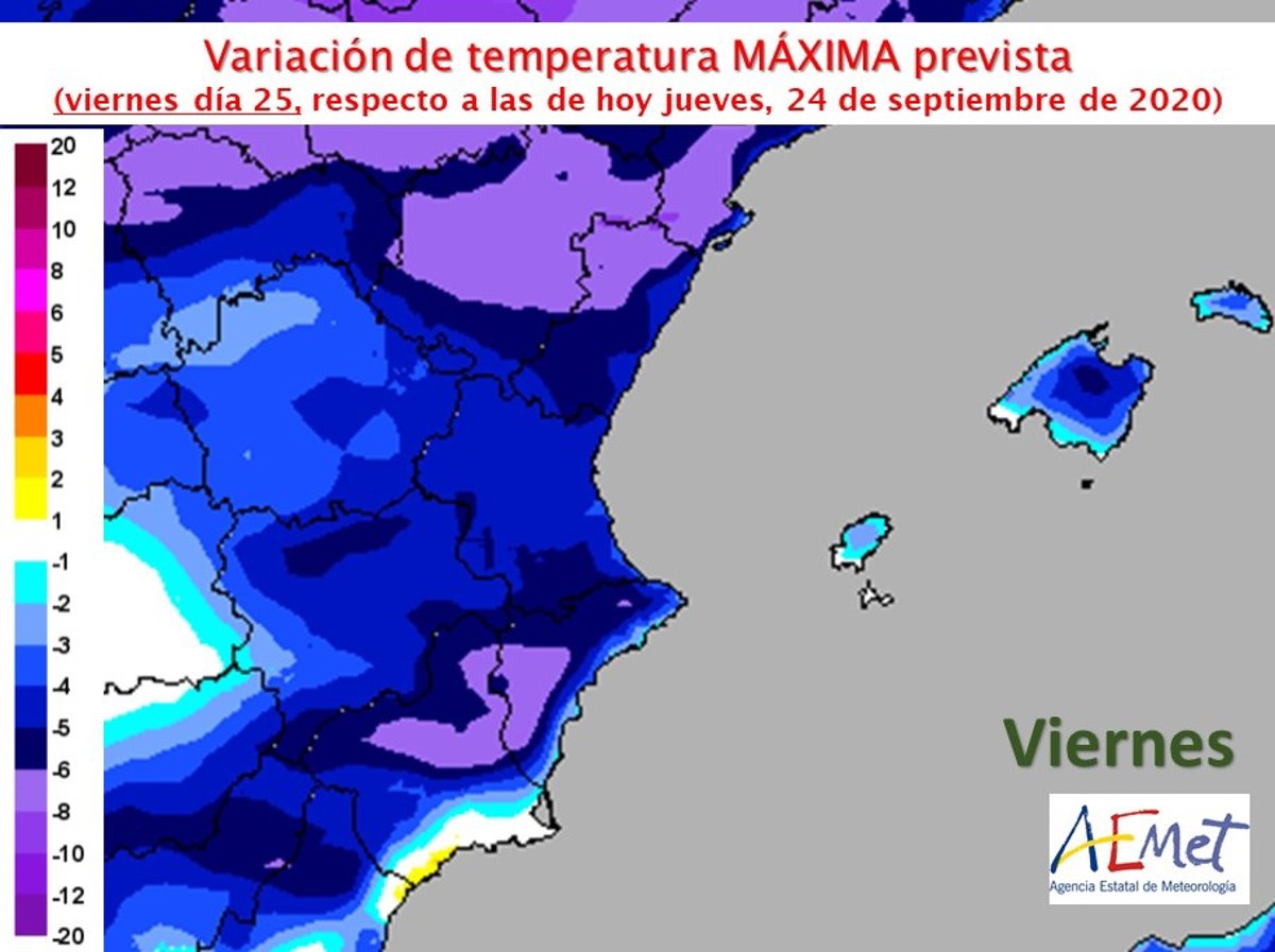 La situación cambiará en las próximas horas si se cumplen las previsiones. Aemet ha publicado un mapa en el que se observa que el descenso térmico en la Comunitat Valenciana irá de los tres a los 10 grados.