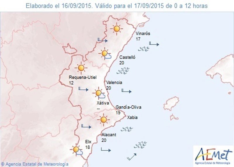 El cielo estará este jueves en la Comunitat Valenciana poco nuboso o despejado y las temperaturas irán en descenso de forma que no superarán los 30 grados, según Aemet.
