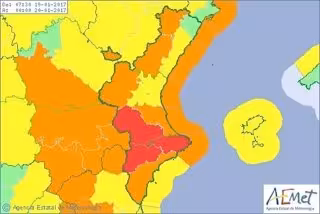 Así, la Comunitat Valenciana está en riesgo por nevadas, lluvias, fenómenos costeros y viento. Por nieve está en aviso rojo, riesgo extremo, el interior y el litoral norte de Alicante, y en naranja el interior de Castellón y Valencia y el litoral sur de Alicante.