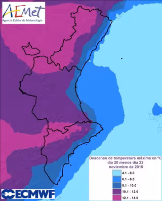 Así, este sábado el mercurio bajará entre 3 a 4 grados, más intenso en zonas del interior, con un marcado descenso hacia el final del día. Además, habrá viento de componente oeste moderado tendiendo a noroeste moderado, con intervalos de fuerte en el interior norte de Castellón, donde las rachas podrán alcanzar los 90 kilómetros por hora. Por este motivo, se ha decretado alerta por viento en el norte de esta provincia.