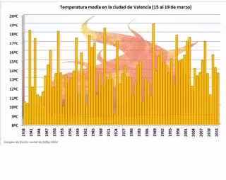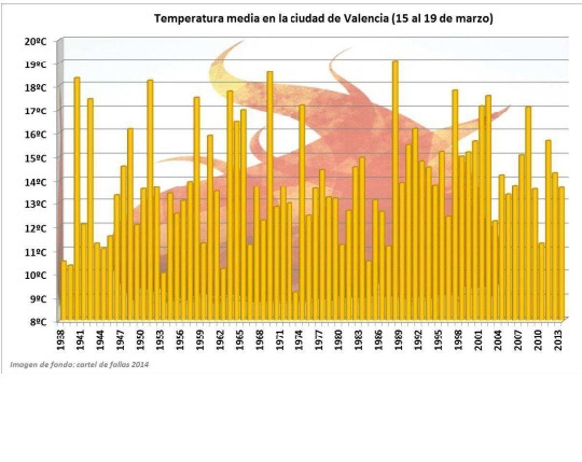 Un estudio de 'El clima normal en Valencia en la Semana Fallera. 15 al 19 de marzo (1938-2013)' señala que la temperaturas media diaria de estos días es de 14 grados, con una máxima de 19 y una mínima de 8.