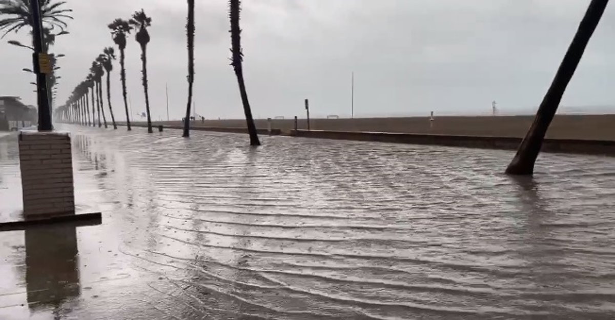 El temporal que azota la Comunitat Valenciana desde este miércoles ha inundado el paseo marítimo de la playa de la Patacona, en Alboraia.