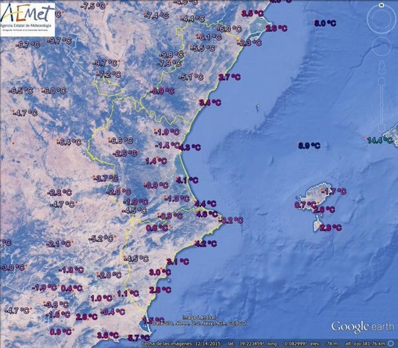 El frente frío que atraviesa España ha provocado que las temperaturas cayeran la pasada madrugada hasta los -9.8ºC en Vilafranca (Castellón), los -7.8ºC en Villena y los -6.6ºC en Utiel (Valencia), según ha informaod Aemet.