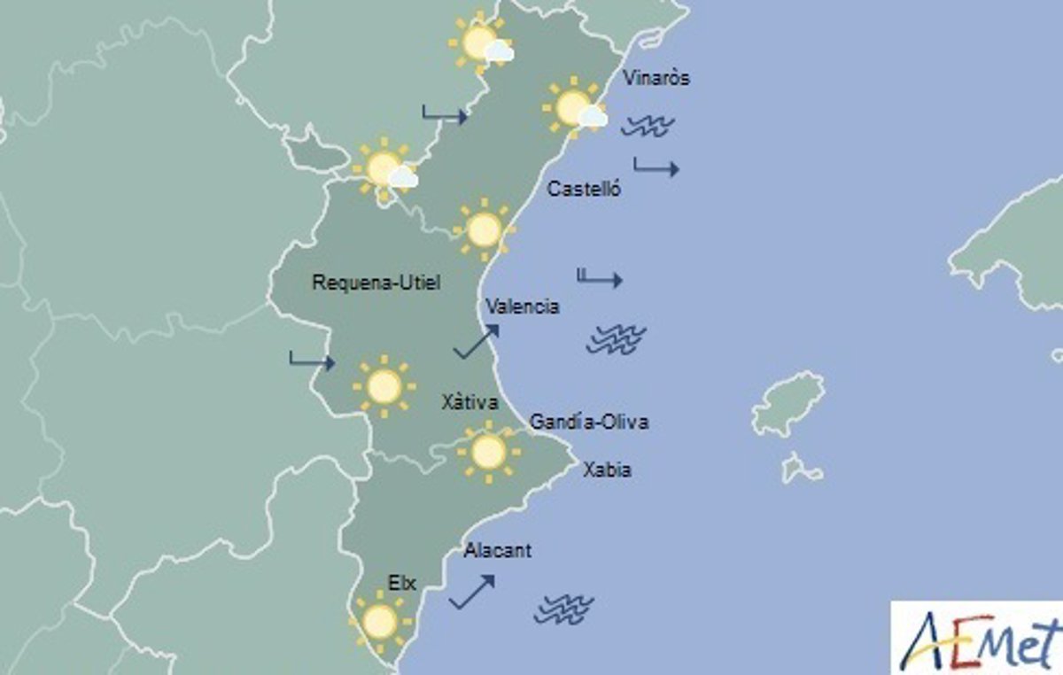 La predicción de la Agencia Estatal de Meteorología (Aemet) para esta jornada espera cielos poco nubosos o despejados en la mayoría de la región y temperaturas con pocos cambios, excepto en el litoral de la Comunitat, donde subirán las máximas localmente de forma notable.