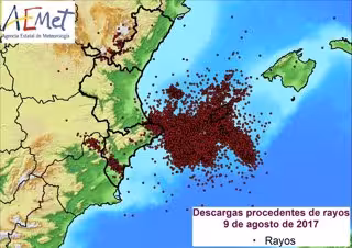 Concretamente, de los 24.436 rayos, un total de 24.100 se registraron entre Alicante e Ibiza, ha indicado Aemet que precisa que "no es frecuente tanta actividad convectiva en el Mediterráneo en la primera quincena de agosto".