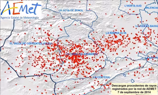 La tormenta registrada el domingo dejó un total de 3.276 rayos en la Comunitat, la mayoría en la comarca valenciana de la Canal de Navarrés, con 716, y la castellonense del Alto Mijares, donde se registraron 490.