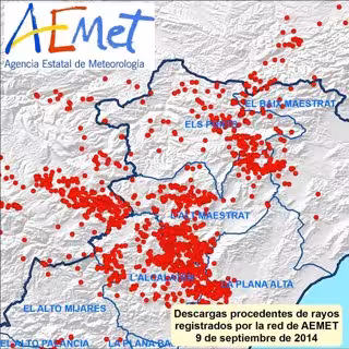 La tormenta registrada el martes dejó un total de 1.532 rayos en la Comunitat Valenciana, la mayoría en el norte de la provincia de Castellón. En concreto, se registraron 403 descargas procedentes de rayos en l'Alt Maestrat, 354 en l'Alcalatén o 190 en la Plana Alta.