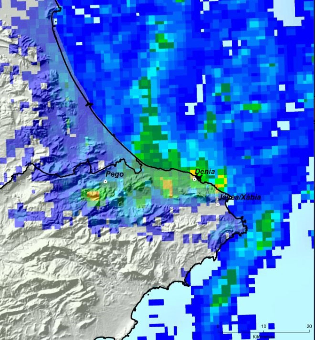 Durante la mañana, el flujo de viento ha sido nor-nordeste en capas bajas. Una zona secundaria de máximos se ha focalizado en la zona de Dénia, donde se han producido chubascos sin tormenta persistentes toda la mañana. Así, el frente ha dejado un "gran contraste" en pocos kilómetros, con 4,8 litros por metro cuadrado en Xbia y casi cien en Dénia.