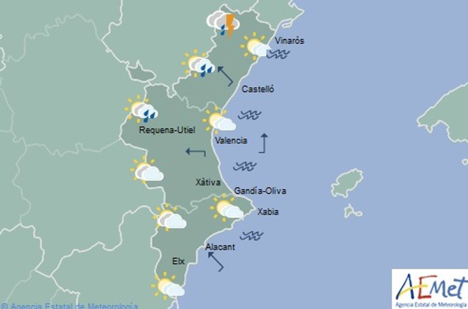 Las temperaturas máximas alcanzarán los 25 grados en València, los 24 en Castellón y los 22 grados en Alicante. Por su parte, el viento soplará variable flojo predominando este y sureste, según las mismas fuentes.