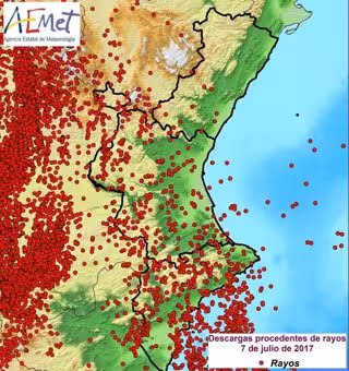 La Aemet ha precisado que de los más de 25.000 rayos que se registraron en toda España, casi 600 fueron en esta autonomía. La mayoría cayó en la provincia de Valencia, en concreto, 301, mientras que hasta 282 lo hicieron en suelo alicantino. En Castellón solo se registraron diez rayos.