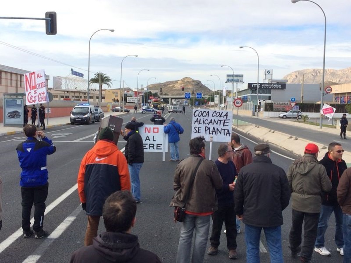 Trabajadores de Coca-cola Alicante han cortado a las 13 horas de este lunes, y durante 30 minutos, la carretera de Ocaña, a su paso por la fábrica, en las dos direcciones, de salida y entrada a la ciudad, como una acción más de rechazo al Expediente de Regulación de Empleo (ERE) que afectará a los 111 trabajadores de una planta que la multinacional tiene previsto cerrar.