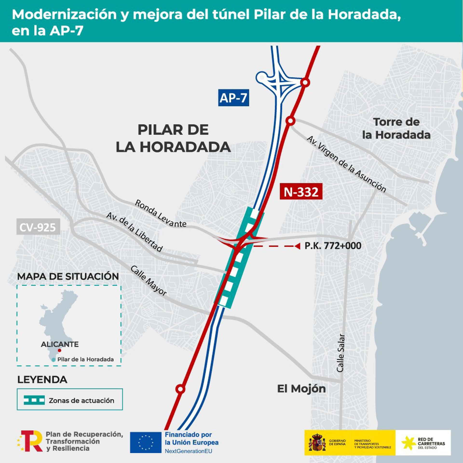 El Ministerio de Transportes y Movilidad Sostenible ha licitado por 4,4 millones de euros (IVA incluido) las obras de modernización y mejora de eficiencia energética del túnel de Pilar de la Horadada, situado en el tramo Crevillente-Cartagena de la AP-7, en la provincia de Alicante. El anuncio será próximamente publicado en el Boletín Oficial del Estado (BOE).