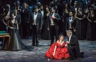 Además del musical, uno de los principales atractivos de esta producción es, sin duda, el vestuario. Valentino, que ha salido a saludar al escenario al final de la función, firma los vestidos de Violetta Valéry que envuelven "con el espíritu de Verdi" --de acuerdo a las palabras del propio diseñador-- a la protagonista. El más reconocible, quizás, el traje rojo Valentino que luce en el tercer acto y cuya tonalidad explosiva contrasta con otro modelo impactante: un traje negro con una cola que evoca a la de un pavo real, o el camisón blanco con el que muere la heroína.