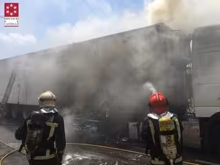 El primer incendio ha afectado esta mañana a dos camiones trailer aparcados en una avenida cercana a un polígono industrial de Almassora. Se ha iniciado al prenderse material de reciclaje en uno de los vehículos, mientras el otro estaba vacío. Los bomberos lo han dado por controlado esta mañana, aunque mantienen el dispositivo porque las llamas siguen en el interior de un camión.